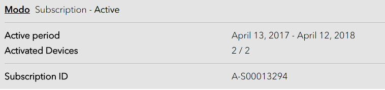 Uma vez na página "View your entitlement", você verá uma lista de suas assinaturas ativas, direitos e dispositivos ativados. É possível verificar se uma licença está em uso, observando a seção "Activated Devices". Caso esteja 2/2 (por exemplo) significa então que a licença está atualmente ativa em 2 máquinas.